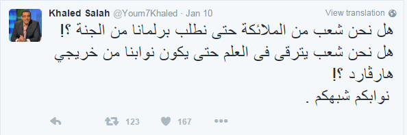 وقال خالد صلاح: “هل نحن شعب من الملائكة حتى نطلب برلمانًا من الجنة؟! هل نحن شعب يترقى في العلم حتى يكون نوابنا من خريجي هارڤارد؟! نوابكم شبهكم”.