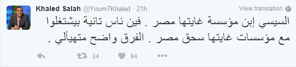 وحاول خالد صلاح الدفاع عن السيسي قائلًا: “السيسي ابن مؤسسة غايتها مصر.. فين ناس تانية بيشتغلوا مع مؤسسات غايتها سحق مصر.. الفرق واضح متهيألي”.