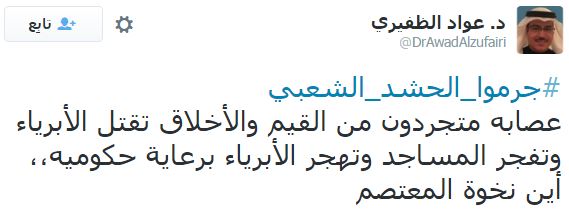 دشن رواد مواقع التواصل الاجتماعي “تويتر” هاشتاجا تحت اسم “#جرموا_الحشد_الشعبي”، اعتراضًا على جرائم ميليشيا الحشد الشعبي المقاتلة في سوريا والعراق، والتي تنتمي فكريًا إلى الشيعة.
