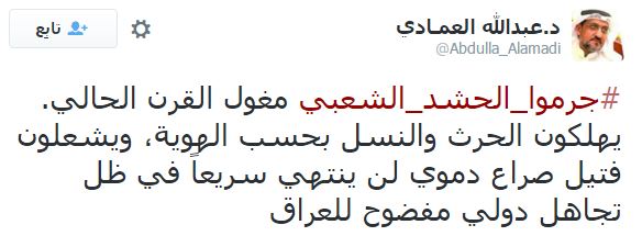 وفي سياق التنديد بجرائم الحشد الشعبي، وصف الكاتب والمدون القطري، عبدالله العمادي، ميليشيا الحشد الشعبي، بمغول القرن الحالي.