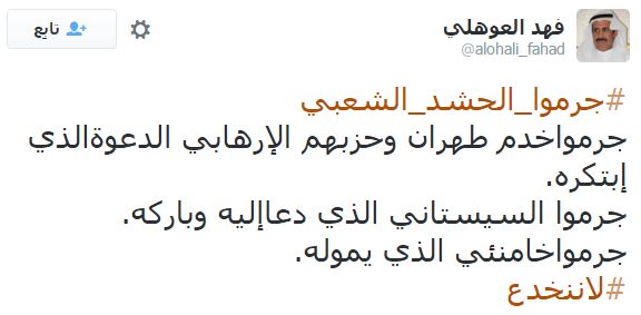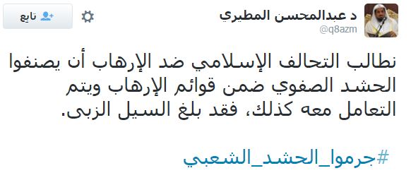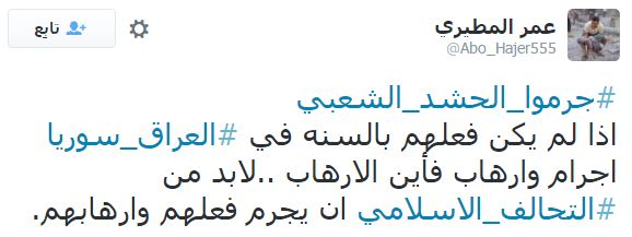 وطالب المغرد عمر المطيري، التحالف الإسلامي بضرورة التدخل لتجريم فعل ميليشيا الحشد الشعبي: