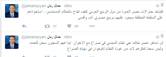 وختم: “فليأخذ جنرالات مصر العبرة من دول الربيع العربي كيف أطاحوا بالحكام المستبدين، بسبب استحواذهم على السلطة المطلقة وهو ما سيعود عليهم بربيع مصري أشد وأقسى”.