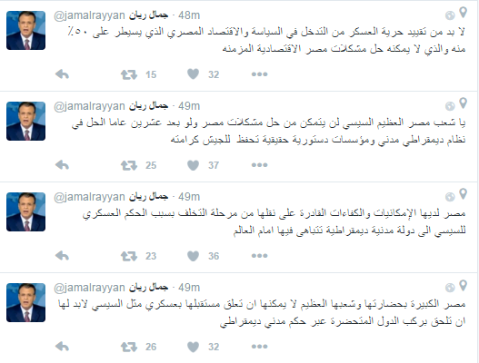 وتابع “ريان”: “مصر الكبيرة بحضارتها وشعبها العظيم لا يمكنها أن تعلق مستقبلها بعسكري مثل السيسي لا بد لها أن تلحق بركب الدول المتحضرة عبر حكم مدني ديمقراطي”.