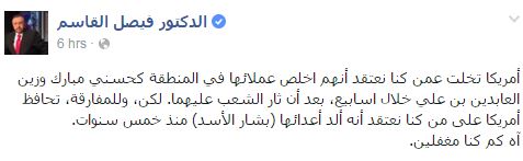 وأضاف القاسم في تغريدة له عبر حسابه الرسمي على موقع التواصل الاجتماعي “تويتر”: “واشنطن تخلت عمن كنا نعتقد أنهم أخلص عملائها في المنطقة كحسني مبارك وزين العابدين بن علي خلال أسابيع، بعد أن ثار الشعب عليهما، لكن وللمفارقة تحافظ أميركا على من كنا نعتقد أنه ألد أعدائها بشار الأسد منذ خمس سنوات.. آه كم كنا مغفلين”.