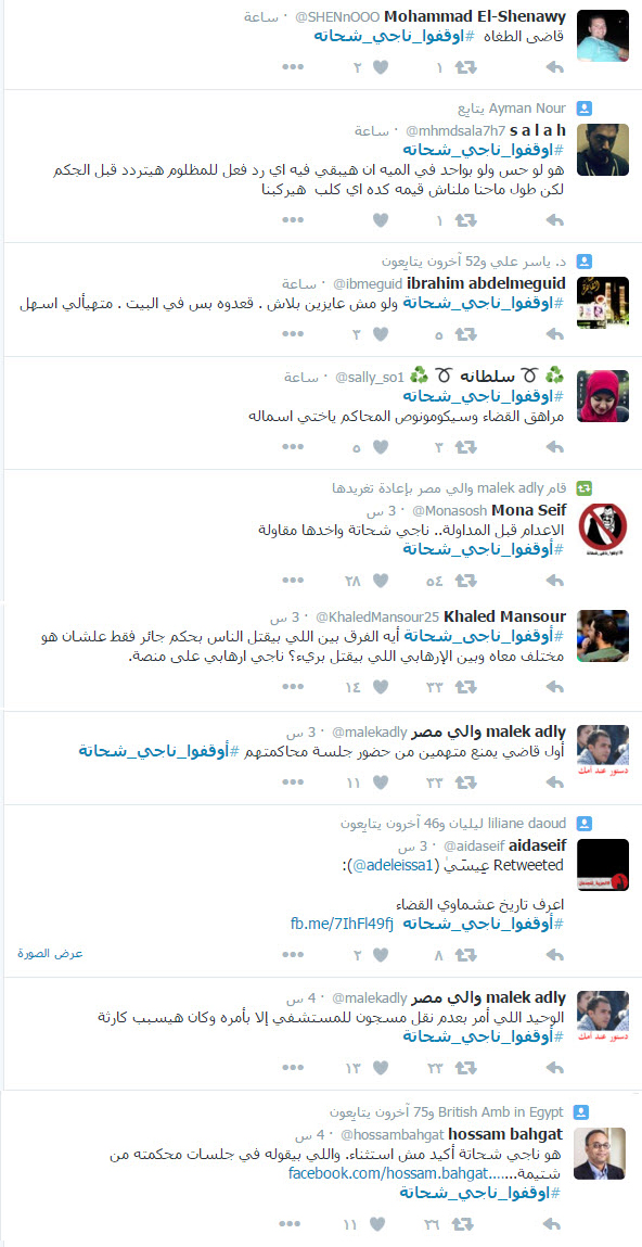 ناجي شحاتة، الشهير بـ”قاضي الإعدامات” لإصداره عشرات الأحكام بالإعدام، وصفه المشاركون، عبر الهاشتاج الذي دخل في قائمة الأكثر تداولًا على “تويتر”، بـ”قاضي الطغاة” و”مراهق القضاء” و”عشماوي”، وشاركت الناشطة السياسية منى سيف قائلة: “الإعدام قبل المداولة.. ناجي شحاتة واخدها مقاولة”، فيما علق الصحفي حسام بهجت: “هو ناجي شحاتة أكيد مش استثناء.. واللي بيقوله في جلسات محكمته من شتيمة”.