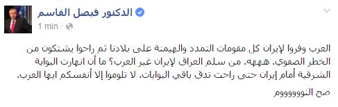 وتساءل القاسم عبر تدوينة له على حسابه الرسمي على موقع التواصل الاجتماعي “فيس بوك”  “من سلم العراق لإيران غير العرب؟”، مشيرًا إلى أنه مع انهيار البوابة الشرقية للوطن العربي، بدأت إيران في التوغل إلى باقي البلدان العربية”.