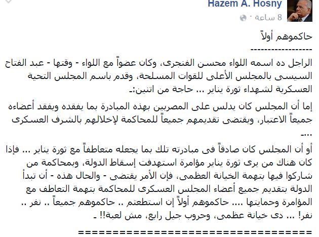 وأضاف “إذا كان هناك من يرى ثورة يناير مؤامرة استهدفت إسقاط الدولة، وبمحاكمة من شاركوا فيها بتهمة الخيانة العظمى، فإن الأمر يقتضي -والحال هذه- أن تبدأ الدولة بتقديم جميع أعضاء المجلس العسكري للمحاكمة بتهمة التعاطف مع المؤامرة وحمايتها”.