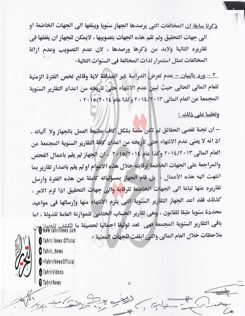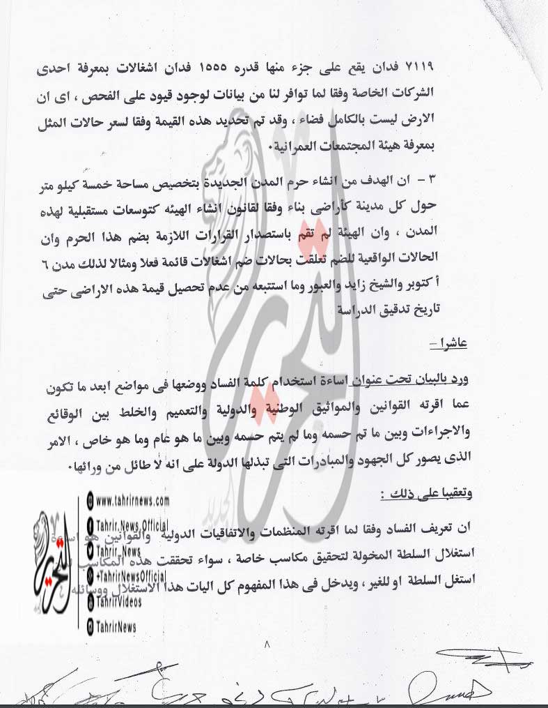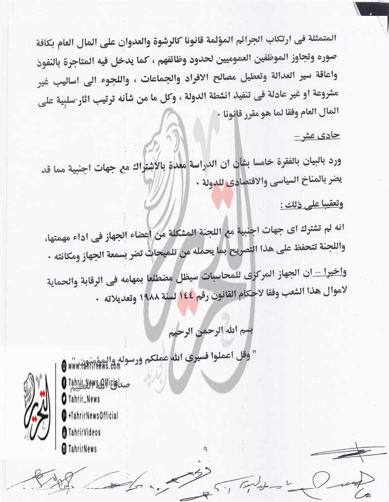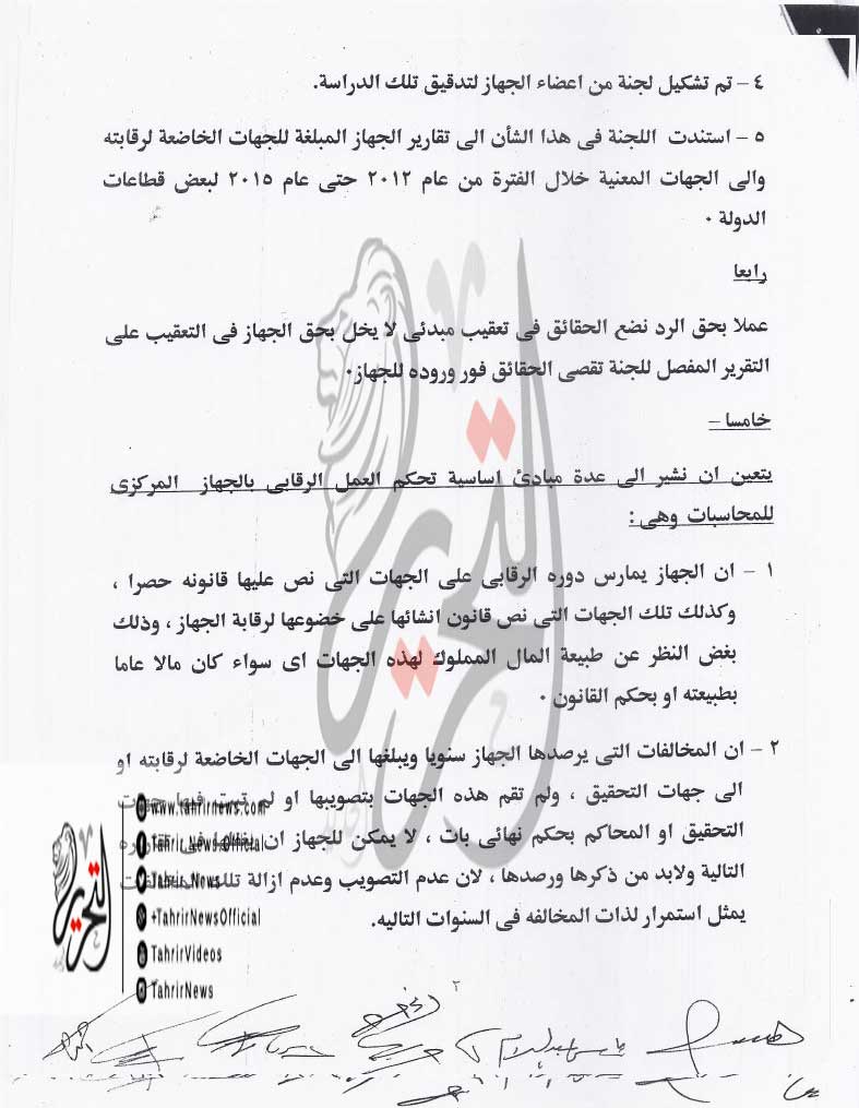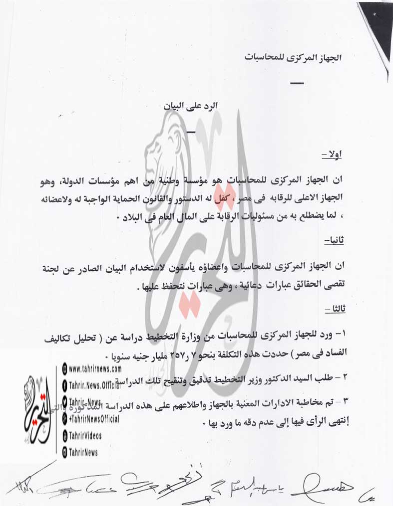 وتابع البيان الرد على كل النقاط التي وجه له الاتهام فيها للجهاز المركزي للمحاسبات ثم اختتم بيانه بالقول إن “الجهاز المركزي للمحاسبات سيظل مضطلعا بمهامه، في الرقابة والحماية لأموال هذا الشعب وفقا لأحكام القانون رقم 144 لسنة 1988 وتعديلاته”.