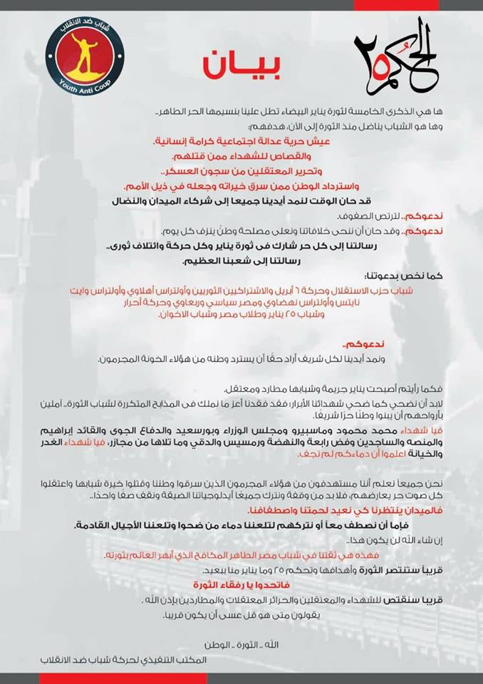أصدرت حركة “شباب ضد الانقلاب” بيانا فى ذكرى ثورة الخامس والعشرين من يناير، دعت خلالها صفوف الشعب المصرى وجميع الحركات الثورية بإعلاء مصلحة الوطن والمشاركة فى ثورة يناير.