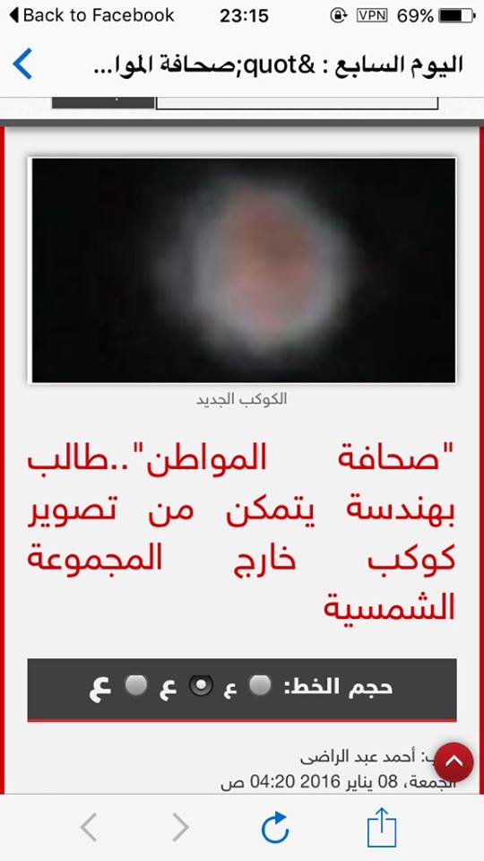 أرسل أحد مستخدمي موقع التواصل الاجتماعي “فيس بوك” رسالة ساخرة إلى موقع “اليوم السابع”، قال فيها إنه اخترع تليسكوبا يحتوي على 600 عدسة مكبرة باسم “كايرو ديك”، واستطاع أن يصور به كوكبا خارج مجرة “درب التبانة” التي يقع فيها كوكب الأرض من فوق سطح منزله، مرسلا صورا لما ادعى أنه الكوكب.