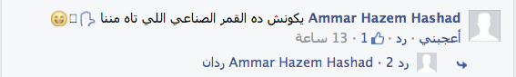 وسخر رواد موقع التواصل الاجتماعي “فيس بوك” من الخبر، حيث قال “عمار حازم حشاد”: “يكونش ده القمر الصناعي اللي تاه مننا؟”.