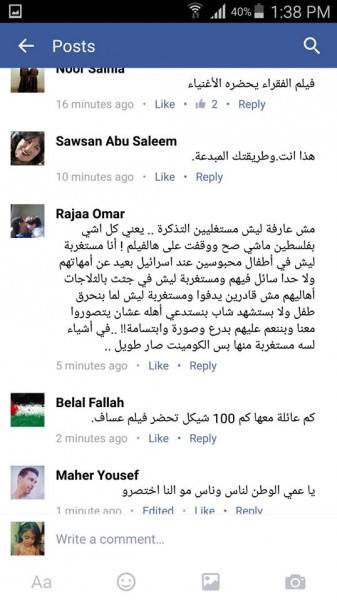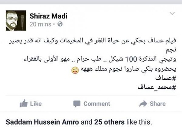 – shiras: فيلم عساف يحكي عن حياة الفقر في المخيمات، وتيجي سعر التذكرة 100 شيكل، طب حرام.. الأولى الفقراء يحضروا الفيلم بلكي صاروا نجوم مثلك.