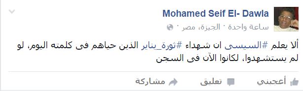أعرب الباحث السياسي محمد سيف الدولة عن دهشته من تحية عبدالفتاح السيسي لشهداء ثورة يناير؛ حيث قال: "ألا يعلم ‫‏السيسي أن شهداء ثورة يناير الذين حياهم في كلمته اليوم، لو لم يستشهدوا، لكانوا الآن في السجن".