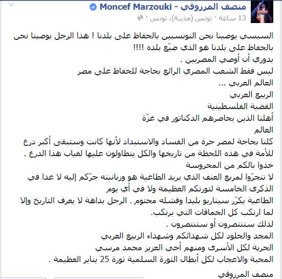 المرزوقي مندهشًا: السيسي يوصينا بالحفاظ على تونس وهو من ضيّع مصر
