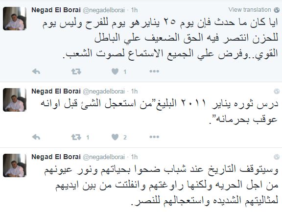 جاء ذلك في عدة تغريدات له عبر حسابه في موقع تويتر، حيث كتب في تغريدة أخرى: “أيًّا كان ما حدث فإن يوم ٢٥ يناير هو يوم للفرح وليس يوما للحزن انتصر فيه الحق الضعيف على الباطل القوي.. وفرض على الجميع الاستماع لصوت الشعب.