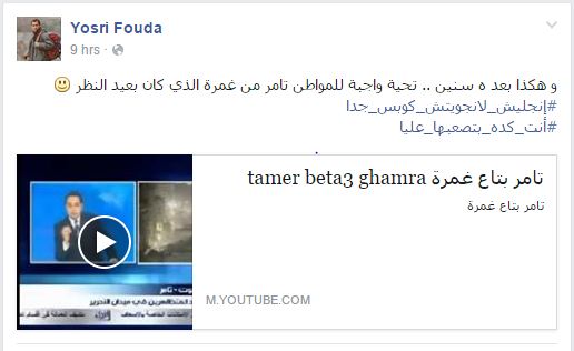 ووجه فودة رسالة شكر واجبة للمدعو “تامر بتاع غمرة” لبعد نظره، مشيرا إلى تحقق نبوءته في ظل القبضة الأمنية الحالية التي تعيشها مصر، مع استمرار تدهور الأوضاع في مصر كما كانت في سابق العهد قبل بدء ثورة الخامس والعشرين من يناير المجيدة.