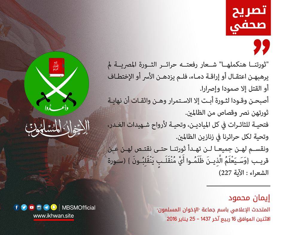 نشرت صفحة المتحدث الإعلامي لجماعة الإخوان المسلمين، بموقع التواصل الاجتماعي “فيس بوك”، تصريحا إعلاميا أكدت فيه استكمال ثورة يناير تحت عنوان “ثورتنا هنكملها”.