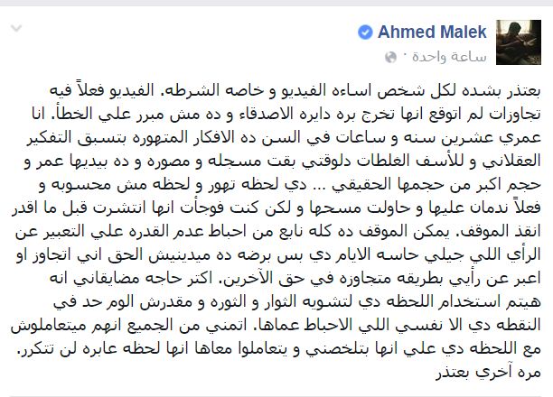 واختتم “مالك” منشوره بأن أكثر ما يسيئه فيما ارتكبه هو أنه سيتم استخدام هذا الفيديو في تشويه الثوار والثورة، معربا عن عجزه من لوم أحد إن فعل ذلك، مضيفا: “أتمنى من الجميع أنهم ميتعاملوش مع اللحظة دي على أنها بتلخصني ويتعاملوا معاها أنها لحظة عابرة لن تتكرر.. مرة أخرى بعتذر”.