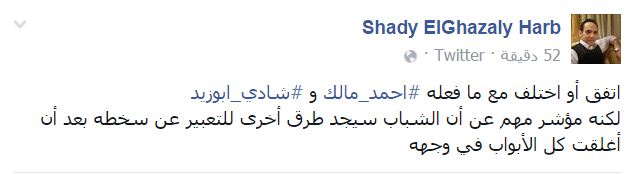 وقال -عبر منشور له على “فيس بوك”-: “اتفق أو اختلف مع ما فعله أحمد مالك وشادي أبو زيد، لكنه مؤشر مهم على أن الشباب سيجد طرقًا أخرى للتعبير عن سخطه بعد أن أغلقت كل الأبواب في وجهه”.