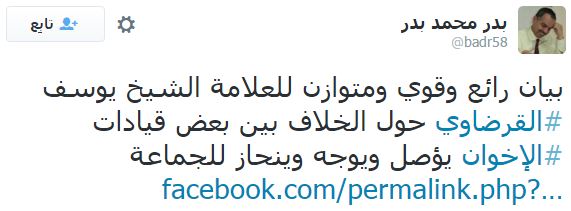 قال القرضاوي في البيان الذي نشر على الصفحة الرسمية له على موقع التواصل الاجتماعي “فيس بوك”: “على إثر ظهور بعض التباينات والخلافات في الرأي والعمل، بين عدد من إخواننا في الجماعة في مصر، وهو ما آلمنا جميعا، وآلم كل غيور على جماعة الإخوان”.