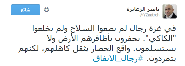 وكتب الكاتب والمحلل السياسي الفلسطيني ياسر الزعاترة على حسابة بموقع “تويتر”: في غزة رجال لم يضعوا السلاح ولم يخلعوا “الكاكي”، يحفرون بأظافرهم الأرض ولا يستسلمون. واقع الحصار يثقل كاهلهم، لكنهم يتمردون.