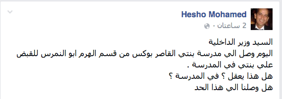 وجه الفنان هشام سليم رسالة إلى وزير الداخلية، قال فيها: “السيد وزير الداخلية، اليوم وصل إلى مدرسة بنتي القاصر بوكس من قسم “أبو النمرس” بالهرم للقبض على بنتي في المدرسة، هل هذا يعقل؟ في المدرسة؟ هل وصلنا إلى هذا الحد؟”.