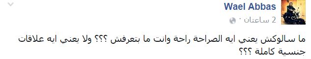 الناشط السياسي وائل عباس: “ما سألوكش يعني إيه الصراحة راحة وانت ما بتعرفش؟؟؟ ولا يعني إيه علاقات جنسية كاملة؟؟؟”.