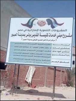 وكان الكاتب الصحفي، جمال سلطان، رئيس تحرير صحيفة “المصريون”، صورة للمشروع الإماراتي للتعمير في مصر، وكتب معلقًا: “أطرف مشروع تنموي إماراتي تقوم به أبوظبي في مصر. مكتوب على “يافطة” المشروع التنموي قيام الإمارات بمشروع مبنى خدمات كنيسة “بولس” بمدينة العبور”.