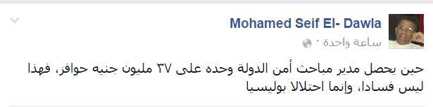 وصف الكاتب محمد سيف الدولة، قضية فساد وزارة الداخلية، بأنها احتلال بوليسي وليست فسادًا فقط؛ حيث قال -في منشور له على حسابه بموقع “فيس بوك”-: “حين يحصل مدير مباحث أمن الدولة وحده على 37 مليون جنيه حوافز، فهذا ليس فسادًا، وإنما احتلال بوليسي”.