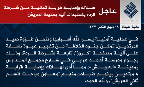نشر حساب منسوب لولاية سيناء التابعة لتنظيم الدولة، على موقع التغريدات القصيرة "تويتر"، بيان أعلن فيه تبني ولاية سيناء تفجيرها لمدرعة عسكرية وقتل ثمانية افراد من الشرطة فى مدينة العريش.