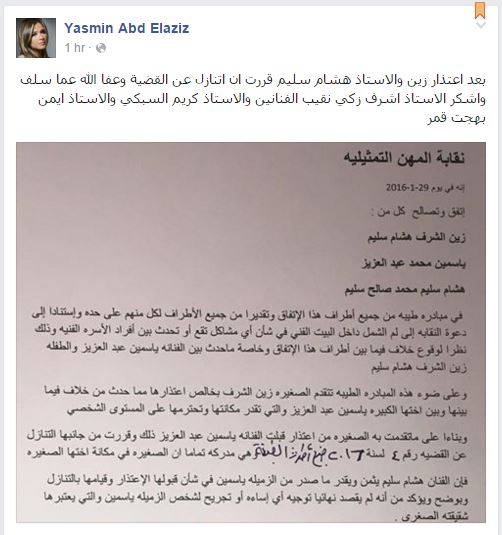 ونشرت الفنانة ياسمين عبد العزيز عبر صفحتها الرسمية بموقع التواصل الاجتماعي “فيس بوك” صورة محضر التصالح المبرم بينهم، وعلقت قائلة: “بعد اعتذار زين والأستاذ هشام سليم قررت أن أتنازل عن القضية، وعفا الله عما سلف، وأشكر الأستاذ أشرف زكي، نقيب الفنانين، والأستاذ كريم السبكي، والأستاذ أيمن بهجت قمر”.