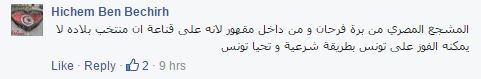 – Hichem Ben Bechirhبقوله : ” المشجع المصري من برة فرحان و من داخل مقهور لانه على قناعة ان منتخب بلاده لا يمكنه الفوز على تونس بطريقة شرعية و تحيا تونس”.