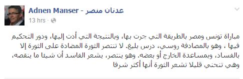 وقال منصر في منشور له على حسابه بموقع التواصل الاجتماعي “فيسبوك” : ” مباراة تونس ومصر بالطريقة التي جرت بها، وبالنتيجة التي أدت إليها، ودور التحكيم فيها، وهو بالمصادفة روسي، درس بليغ”.
