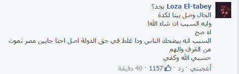 – Loza : ”  بجد؟  الحال وصل بينا لكده ، وايه السبب ان شاء الله!  اه صح ،  السبب انه بيضحك الناس ودا غلط في حق الدولة اصل احنا جايين مصر نموت من القرف والهم ، حسبي الله وكفي “