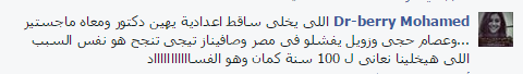 – Dr-berry : ” اللى يخلى ساقط اعدادية يهين دكتور ومعاه ماجستير …وعصام حجى وزويل يفشلو فى مصر ، وصافيناز تيجى تنجح هو نفس السبب اللى هيخلينا نعانى  100 سنة كمان بسبب الفساد ”
