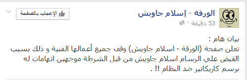 أعلنت  بعد عصر اليوم  صفحة الرسوم الكاريكاتيرية ” الورقة ” ، القبض علي الرسام ” إسلام جاويش  ” ،
