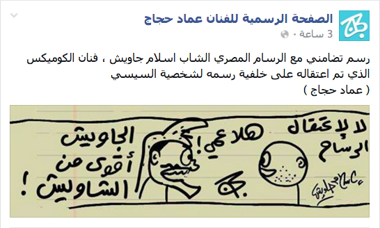 وكتب الفنان على صفحته: “رسم تضامني مع الرسام المصري الشاب اسلام جاويش، فنان الكوميكس الذي تم اعتقاله على خلفية رسمه لشخصية السيسي”.