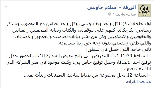 وسرد “جاويش” -عبر صفحته على “فيسبوك”- ما حدث له، قائلا: “الساعة 11:30 كنت المفروض إني رايح معرض القاهرة للكتاب لحضور حفل توقيع أحد الأصدقاء وحفل توقيع خاص بي، وكنت موجود في مقر الشركة اللي أنا شغال فيها”.