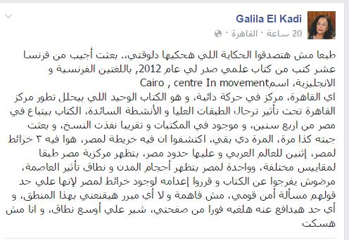وأضافت: “الكتاب بيتباع في مصر من اربع سنين، وموجود في المكتبات وتقريبا نفذت النسخ، وبعثت جبته كذا مرة، المرة دي بقي، اكتشفوا إن فيه خريطة لمصر، هوا فيه ٣ خرائط لمصر، إثنين للعالم العربي وعليها حدود مصر، بتظهر مركزية مصر طبقًا لمقاييس مختلفة، وواحدة لمصر بتظهر أحجام المدن ونطاق تأثير العاصمة، مرضوش يفرجوا عن الكتاب وقرروا إعدامه لوجود خرائط لمصر لإنها علي حد قولهم مسألة أمن قومي، مش فاهمة ولا أي مبرر هيقنعني بهذا المنطق، وأي حد هيدافع عنه هلغيه فورا من صفحتي، شير على أوسع نطاق، وأنا مش هسكت”.