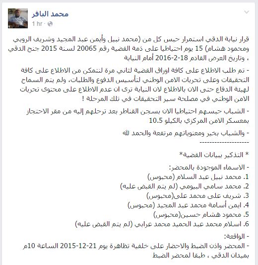 وأوضح “الباقر” في منشور له عبر صفحته الشخصية بموقع التواصل الاجتماعي “فيس بوك”، أن النيابة رفضت السماح لهيئة الدفاع بالاطلاع على كل التحقيقات وتحريات الأمن الوطني، في القضية رقم 20067 لسنة 2015 جنح الدقي.