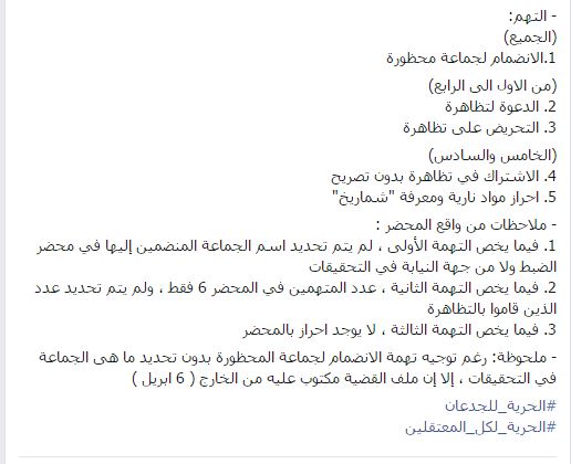 يذكر أن نيابة الدقي وجهت تهم الانضمام لجماعة محظورة، والدعوة للتظاهر، والتحريض على التظاهر والتظاهر دون تصريح، لشريف الروبي وخمسة آخرين، وتم القبض على أربعة منهم، والباقي مطاردون من قبل الأجهزة الأمنية.