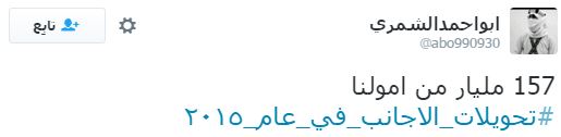 “#حملة_القضاء_علي_البطاله”، “#تحويلات_الأجانب_في_عام_٢٠١٥”، “#اطردوا_السوريين_من_السعودية”.