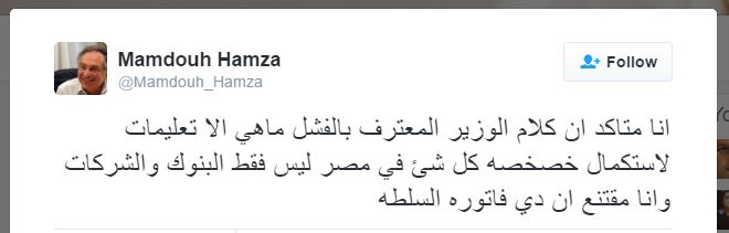 وأوضح حمزة عبر حسابه الشخصي بموقع التغريدات القصيرة “تويتر” أن ما قاله وزير النقل من اعتراف بالفشل، ما هو إلا تعليمات لاستكمال خصخة مصر بالكامل، مشيرا إلى أنه ستتبع تلك الخطوة خصخصة البنوك والشركات الحكومية أيضا.