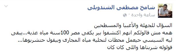 وقال -عبر منشور له على “فيس بوك”-: “السؤال للجهلة والأغبيا والمسطحين، همه مش قالولكم إنهم اكتشفوا بير تكفي مصر 100 سنة مياه عذبة؟ يبقى ليه السيسي حيعمل محطات لتحلية مياه المجاري وبيقول حتشربوها.. قولوله شربناها واللي كان كان”.