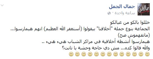 وأضاف “الجمل” ساخرًا: “خللوا بالكو من عيالكو، الجماعة بتوع حملة “أخلاقنا” بيقولوا (أستغفر الله العظيم) إنهم هيمارسوا… (ماتفهموش صح).. هيمارسوا أنشطة أخلاقية في مراكز الشباب هيء هيء.. والله قالوا كده.. مش دي حاجة وحشة يا تانت؟”.