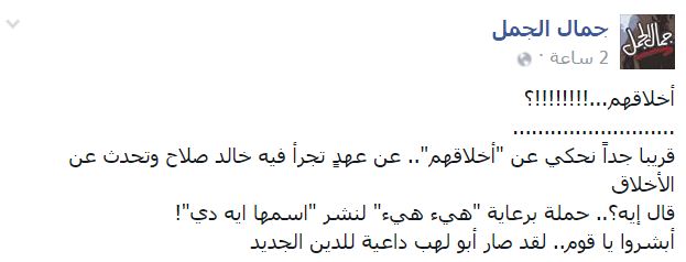 وقال -عبر منشور له على “فيس بوك”-: “قريبًا جدًا نحكي عن “أخلاقهم”.. عن عهدٍ تجرأ فيه خالد صلاح وتحدث عن الأخلاق قال إيه؟.. حملة برعاية “هيء هيء” لنشر “اسمها إيه دي“! أبشروا يا قوم.. لقد صار أبو لهب داعية للدين الجديد”.