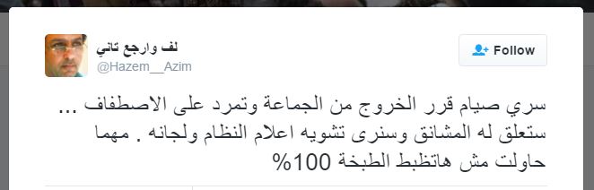 وأكد “عبدالعظيم أن المستشار سري صيام سيواجه هجوما عنيفا من إعلام السيسي بعد استقالته من البرلمان”، مؤكدا أنه ستعلق له المشانق، موجها رسالة إلى السيسي جاء نصها: “مهما حاولت مش هاتظبط الطبخة 100%”.