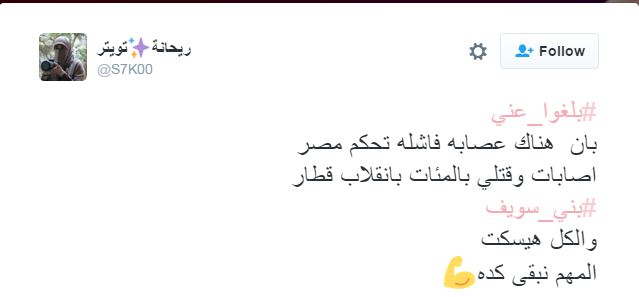 ريحانة تويتر: #بلغوا_عني بأن هناك عصابة فاشلة تحكم مصر، إصابات وقتلي بالمئات بانقلاب قطار.. والكل هيسكت