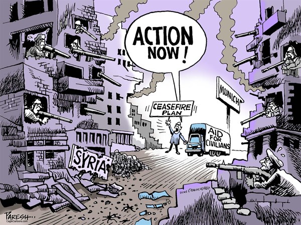 أما عن قرار وقف إطلاق النار في سوريا فسخر موقع “بولتيكال كارتونز” بهذا الرسم: