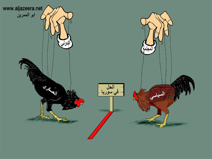 ونشر موقع “الجزيرة دوت نت” صورة معبرة عن تلاعب المجتمع الدولي بالحلين السياسي والعسكري في سوريا وفقًا لأهواء المجتمع الدولي: